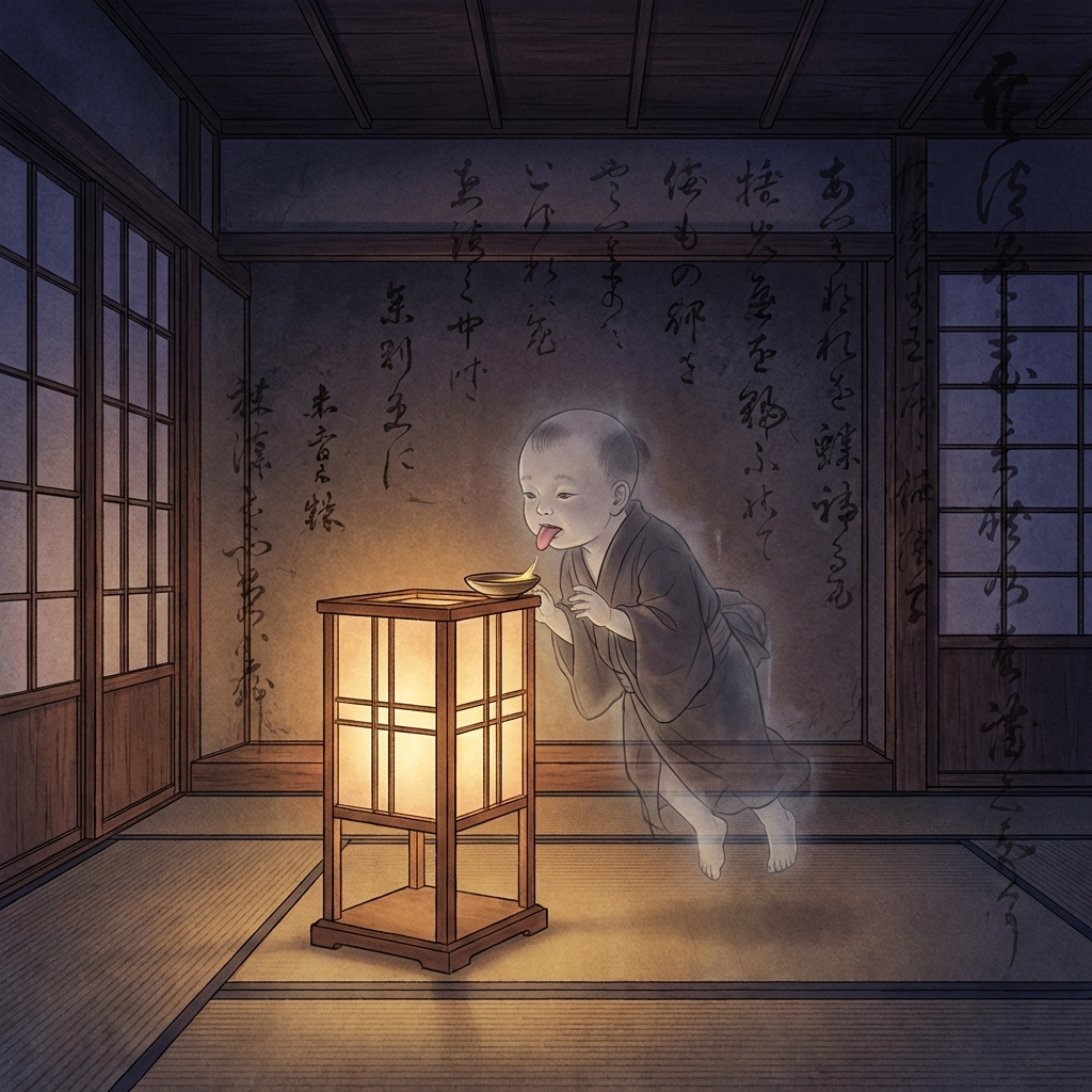 Aburaakago (油赤子), often referred to as the “Oil-Licking Baby,” is a mysterious spirit known for its strange craving for lamp oil. It is sometimes associated with the term Aburaname (油舐め), meaning “oil-licker.”