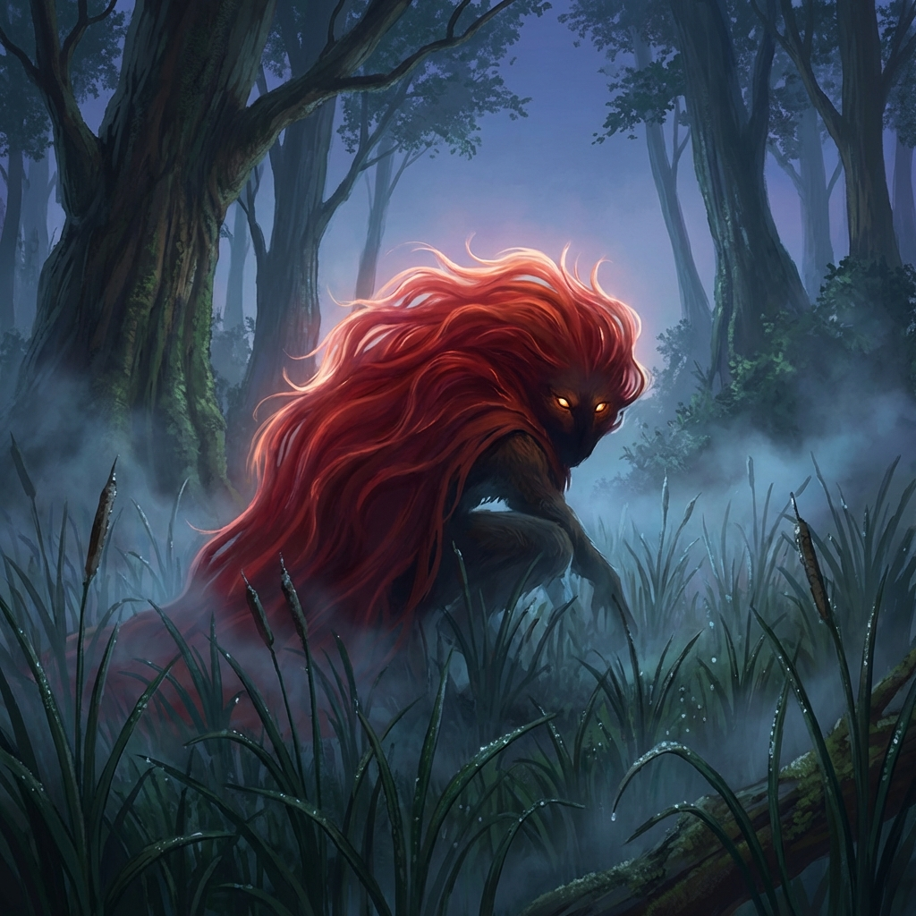 The Akagashira is depicted as a small, humanoid figure completely dominated by a massive, wild mane of flaming red hair. This hair is so long and thick that it often obscures the creature’s entire body, trailing behind it like a scarlet cape.