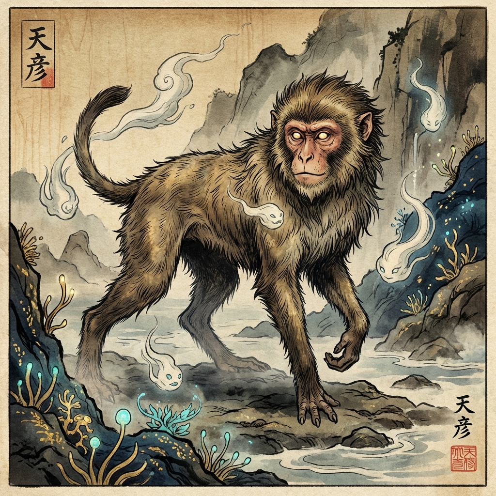Descriptions of the Amabiko vary, but it is generally described as a hairy, ape-like or simian creature. It typically has three or four legs, large round eyes, and a beak-like or protruding mouth. Some versions describe it as glowing with a holy light as it emerges from the waves.