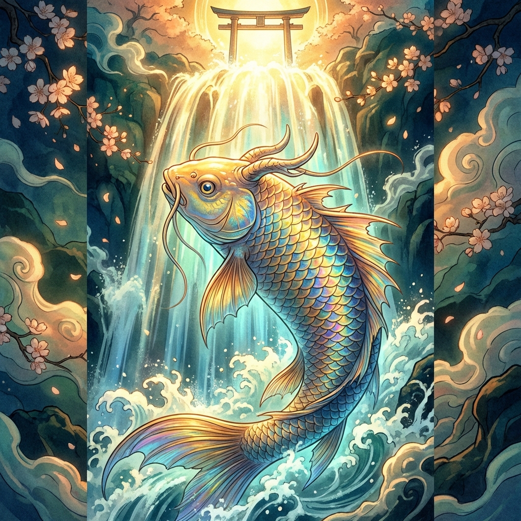 The legend of the transformed carp has its roots in ancient Chinese mythology (the Longmen or Dragon Gate legend), which was later fully absorbed into Japanese culture. It represents the journey of a humble creature achieving spiritual and physical greatness through sheer willpower and effort.