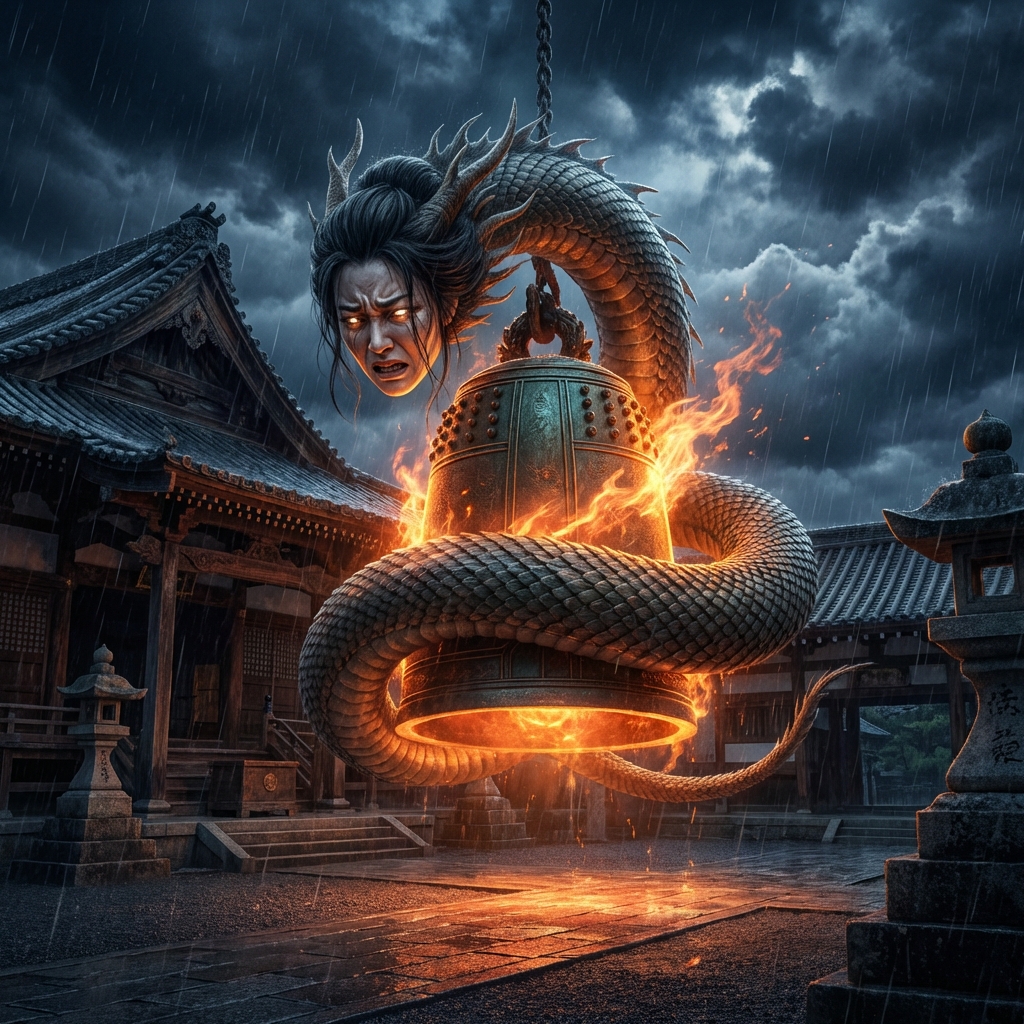 The legend centers on Kiyohime, a young woman who fell obsessively in love with a traveling priest named Anchin. When Anchin broke his promise to return to her, Kiyohime’s pure, agonizing rage transformed her into a terrifying giant serpent.