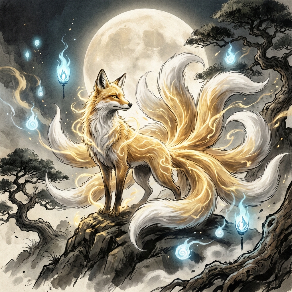 Kyūbi no Kitsune (九尾の狐), the “Nine-Tailed Fox,” is the ultimate evolution of a fox spirit—a god-like entity possessing infinite wisdom, near-omniscience, and power that can shape the fate of empires.