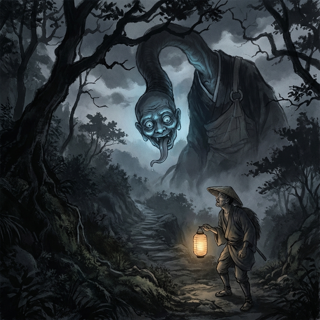 A Mikoshi-nyūdō usually appears as a small, harmless-looking monk standing by a roadside or under a bridge. However, the moment a traveler looks at its face, its neck begins to stretch and its entire body grows upward at a supernatural rate.