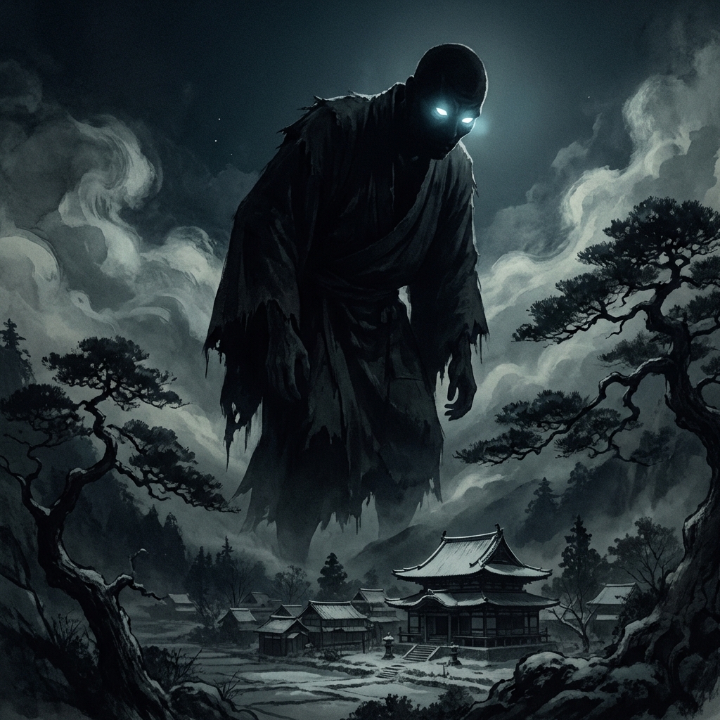 Ō-nyūdō (大入道), the “Great Monk,” is a diverse class of giant apparitions that haunt the dark roads and abandoned temples of Japan, manifesting as enormous, bald-headed priests of terrifying size.