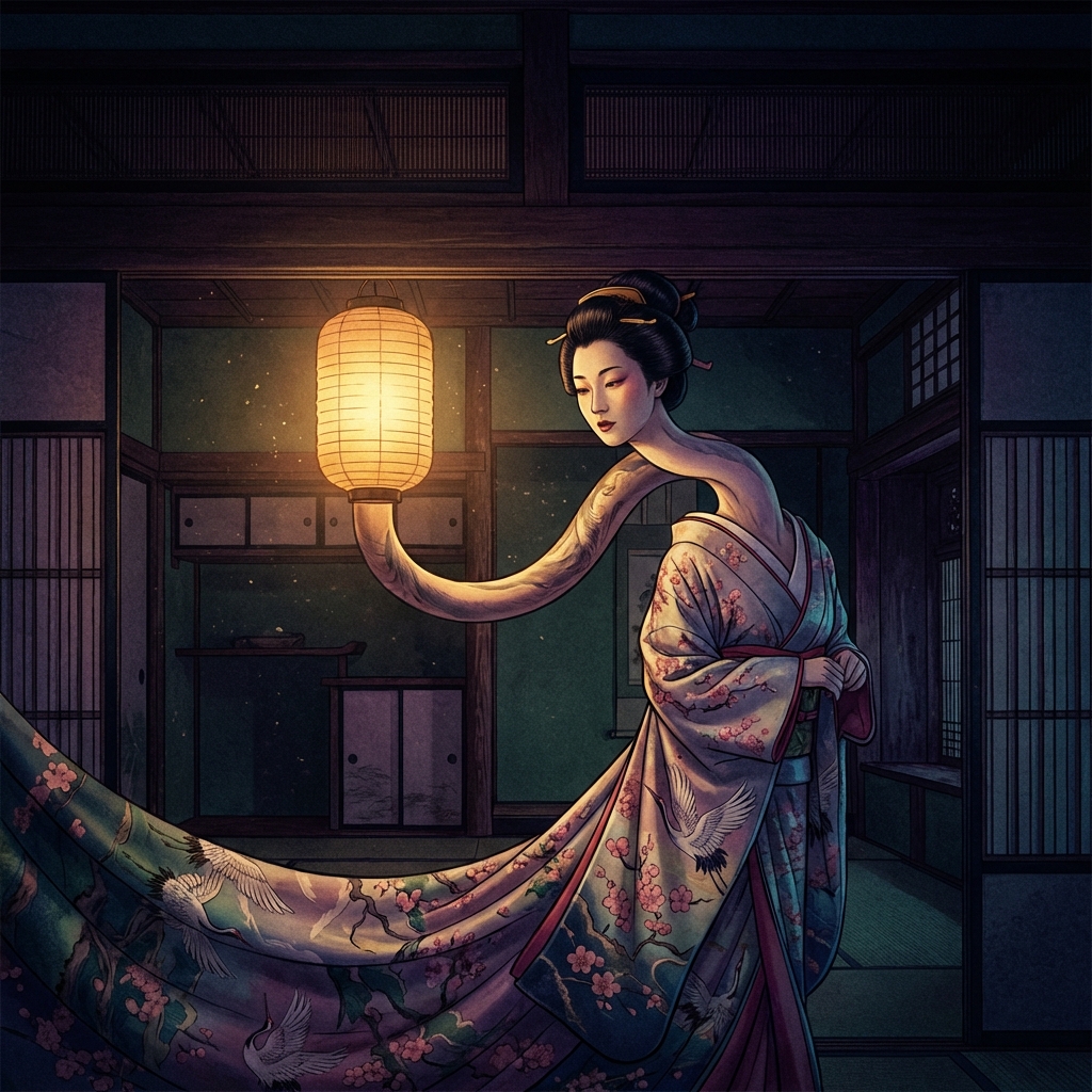 Rokurokubi (ろくろ首), the “Long-Necked Woman,” is a classic tragic-horror yokai—a human woman who appears perfectly normal by day, but whose neck stretches like a snake at night as her head wanders the house in search of oil or human warmth.