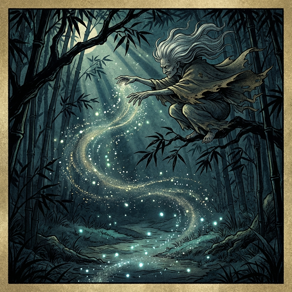 Sunakake-baba (砂かけ婆), the “Sand-Throwing Hag,” is a mysterious and mischievous spirit that lurks in the shadows of bamboo groves and temple paths, blinding travelers with a sudden shower of grit.
