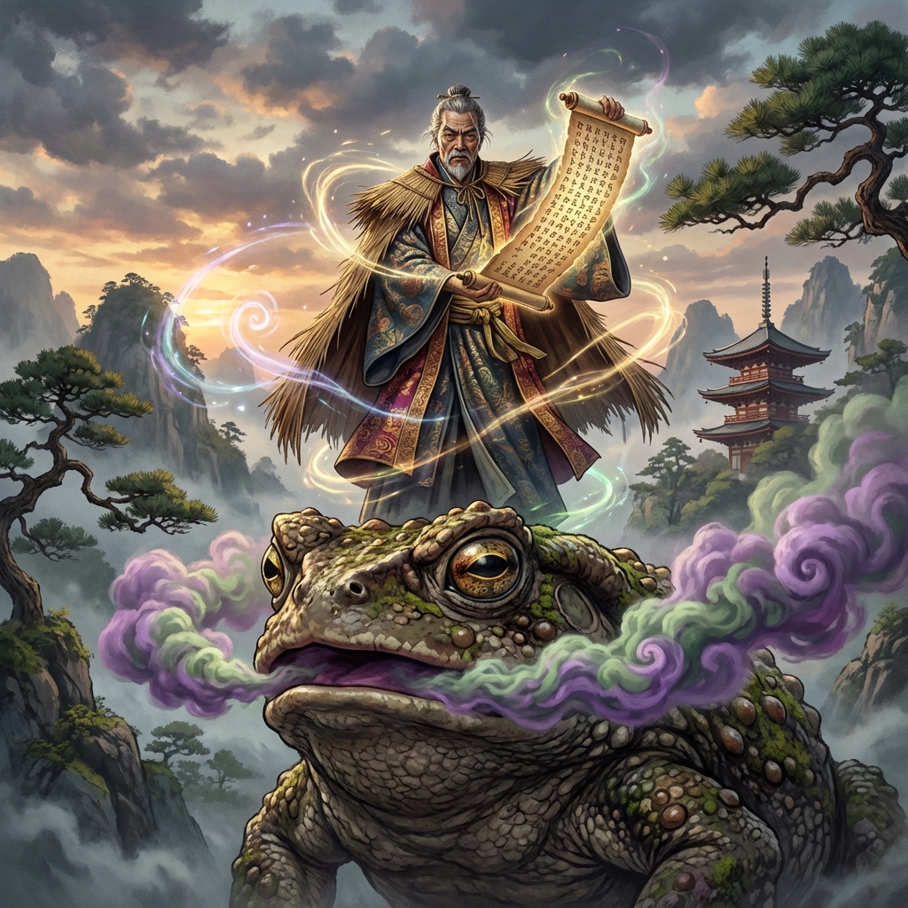 His origin is the life of a 17th-century merchant who actually traveled to Southeast Asia and India. However, in the 1804 Kabuki play Tenjiku Tokubei Ikusa-banashi, he was reimagined as a man who discovered the forbidden “Christian Magic” in a foreign land. According to the play, he returned to Japan with the power to summon a Giant, Fire-Breathing Toad. He represents the Fear of the Foreign—the idea that people who leave Japan’s shores might return with powers that could dismantle the Shogunate.