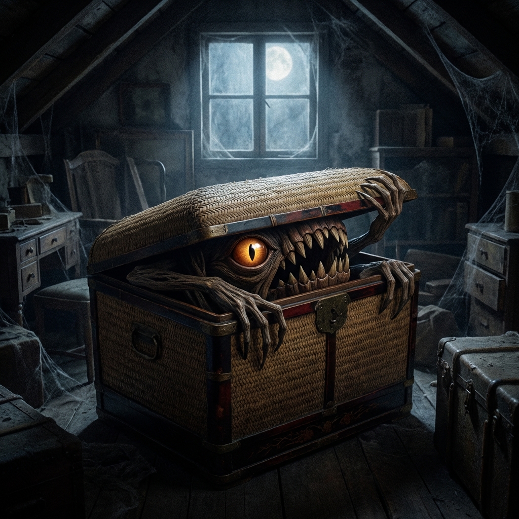 It is rarely dangerous but highly mischievous. It enjoys hiding in the corner of a storage room and “shifting” its position just enough to make a servant or a housewife think they are losing their mind. When the lid is opened, it might let out a puff of ancient dust that takes the shape of small ghosts or birds before vanishing.